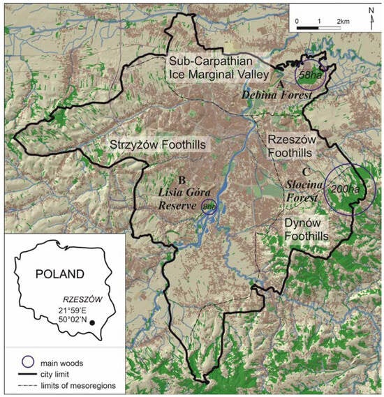 Forest ecosystems are an important component of urban natural systems, contributing to the protective and recreational potentials of these systems []. Simultaneously, they provide a variety of ecosystem services (ES) [,,], which may be threatened by excessive urban development []. The ecosystem services of urban forests represent all three groups of services specified by the latest CICES classification []: provisioning, regulating and maintaining, and cultural. They can also pose threats to humans, especially given the various aspects of plant cover [,,]. In the literature, these threats are regarded as ecosystem disservices (EDS) [,,,]. The concept of ecosystem services was proposed in the mid-20th century [], and the contemporary literature on this issue is extremely rich. Ecosystem services are often understood as a set of products and functions of ecosystems, as noted in Costanza et al. [], or refer to human welfare, as in the CICES classification, where ecosystem services are defined as “the contribution that ecosystems make to human well-being” []. They can also be perceived very broadly as the benefits that humans derive from the environment []. In turn, the ecosystem services potential can be regarded as the “hypothetical maximum yield” that the ecosystem is able to provide []. This definition is similar to the much earlier concept of environmental potential proposed by G. Haase [], where it referred to the ability to satisfy a certain human need, e.g., recreation. The ability to perform a recreational function is one of the most important potentials of urban forests, which can be classified in the ES concept as the cultural ES (CES) [,]. Another important potential of urban forests is their ability to function as a biodiversity refuge [] or in other aspects related to natural or, more broadly, protective functions, such as regulation of the microclimate or water circulation []. In the ES concept, they belong to the regulating and maintaining (RES) category. As highlighted by Jim and Chen [] and Giedych and Maksymiuk [], RES and CES are considered the most important services for cities rather than provisioning ones (PES). Therefore, indicators for determination of the potential for RES and CES can be a useful tool for diagnosing urban forest ecosystems in terms of their ability to meet recreational and nature conservation needs. These potentials are complementary but sometimes conflicting; hence, they should be estimated simultaneously. This may help to make optimal decisions in terms of management and conservation of forest ecosystems []. In city conditions, this may involve the protection of valuable urban forest enclaves with concurrent residents’ access to the forests. Such recommendations are particularly important in cities with a shortage of forest areas, or their apparent incorrect use or management [,]. The assessment of the potential of such forests, especially in terms of their protective and recreational functions, may help to optimise their functioning. Such an assumption was made in our analysis of the ecosystem of Rzeszów, a city in southeastern Poland with a defective natural system []. Although it is located on the edge of the Carpathian Mountains [], the city has the lowest forest area in comparison with all province capitals in the country []. Additionally, the natural structure of these forests has not been properly recognised to date, which has impeded the undertaking of appropriate protective measures. Concurrently, there may be strong recreational pressure within the forests, as the residents of Rzeszów believe that the number of recreational forest areas is insufficient []. The recreational pressure may conflict with the necessity to protect valuable elements of the natural structure of urban forests.