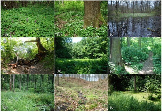 Habitat diversity of the study areas: (A) Dębina Forest: (a) floristic richness of Tilio cordatae–Carpinetum betuli oak–hornbeam forest, (b) monumental size Quercus robur and protected Allium ursinum, (c) hydrophilic Magnocaricion elatae communities; (B) Lisia Góra reserve: (a) dying Quercus robur, (b) Ficario-Ulmetum minoris riparian forest on the Wisłok River floodplain, (c) Tilio cordatae–Carpinetum betuli oak–hornbeam forest; (C) Słocina Forest: (a) Carici remotae–Fraxinetum riparian forest, (b) slopes of the Carpathian threshold with diversified relief, (c) landslide lake with Lemnetea minoris aquatic vegetation.