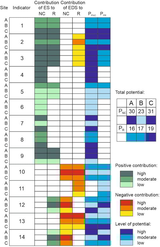 Matrix of contribution of ecosystem services (ED) and ecosystem disservices (EDS) to the partial nature conservation (PPNC) and recreational (PPR) potentials of the investigated forests (A–C) and the total potentials of forests (PNC and PR). Nos. 1–14: indicators related to ES and EDS (see Table 1).