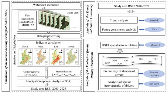 The research methodology in this study comprises three main components (Figure 3). First, the RSEI for the UMFRB was calculated for the 2000–2023 period via the GEE platform. Second, the trends in the RSEI were quantified via Sen’s slope estimation and the Mann–Kendall test, and future consistency was determined via the Hurst exponent method. Finally, the spatial autocorrelation of the RSEI was verified via Moran’s I, while the driving factors influencing the RSEI in the UMFRB were analyzed via Pearson’s correlation analysis and the geographically weighted regression (GWR) model.