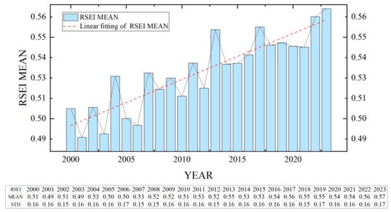 In this study, the RSEI was employed to assess the quality of the ecological environment in the study area, leveraging its ability to integrate multiple ecological elements. Specifically, the RSEI incorporates key ecological indicators such as the NDVI, WET, LST, and NDBSI to characterize ecosystems from various perspectives. The RSEI values for each year in this study ranged from 0.49 to 0.57, which aligns closely with findings from related research [,], thereby demonstrating the effectiveness of the RSEI in evaluating the ecological quality.