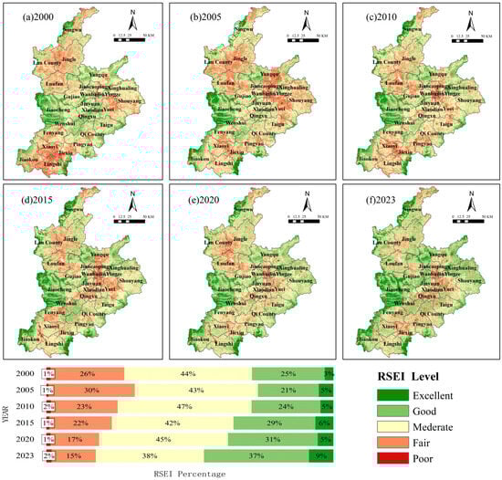 Spatial distributions of the various RSEI classes in the study area. (a) RSEI distribution map of 2000; (b) RSEI distribution map of 2005; (c) RSEI distribution map of 2010; (d) RSEI distribution map of 2015; (e) RSEI distribution map of 2020; and (f) RSEI distribution map of 2023.