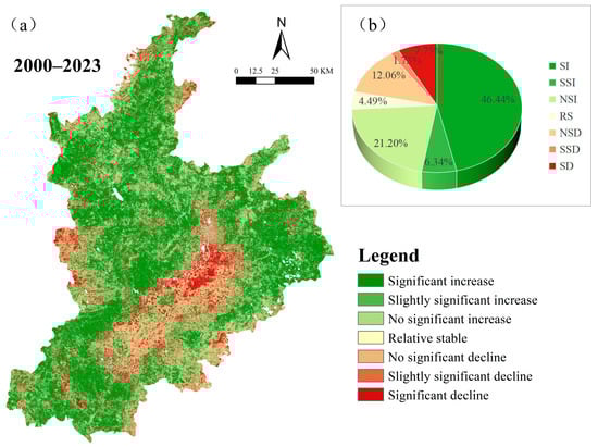 Trends in the RSEI within the study area from 2000 to 2023. (a) Spatial distribution of trends and (b) proportion of each trend type.