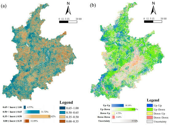 Spatial distributions of the Hurst index values (a) and future consistency (b).