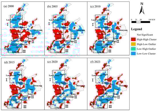 The local spatial autocorrelation of the regional RSEI was analyzed via the LISA clustering results. Overall, the nonsignificant areas exhibited a decreasing trend (Figure 8). Area I, located at the junction of Jingle, Lan, and Loufan Counties in the upper Fen River Basin, exhibited a continuous decrease in L–L clusters. Area II, encompassing southern Taiyuan, eastern Wenshui, and western Qixian, exhibited the most significant changes. In 2000, H–H clusters dominated, but after more than 20 years of socioeconomic development, H–H clusters declined, whereas L–L clusters expanded and eventually dominated. Area III, which includes Xiaoyi, Jiexiu, Lingshi, and Jiaokou, initially featured L–L clusters in 2000 and 2010, but the L–L clusters contracted and shifted northward after 2015.