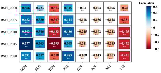 RSEI and driving factor Pearson’s correlation (notes: ** indicates significance of the parameters at the 1% level).