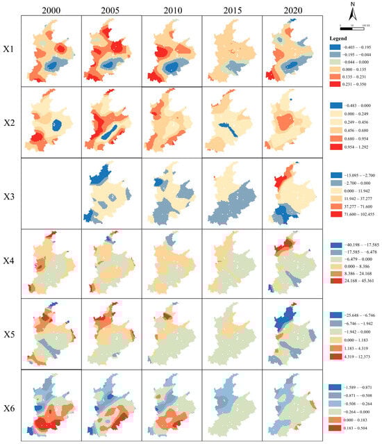 Spatial distribution of the regression coefficients of the GWR model (notes: X1, X2, X3, X4, X5, and X6 denote SLO, PRE, GDP, POP, NLI, and LUI, respectively).