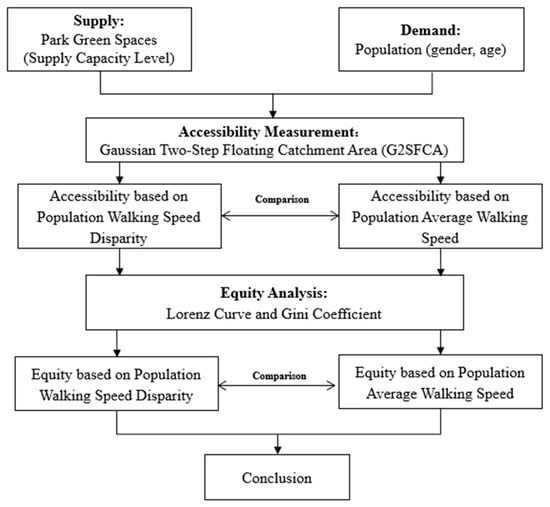 The research framework of this study is outlined in Figure 1. First, PGSs are classified according to their size and supply capacity. The residential population of each district, categorized by age and gender, is considered as representative of the potential demand for these PGSs. Second, spatial accessibility is calculated using the G2SFCA method, based on Wuhan’s road network. This analysis considers both the average walking speed of the total population and the varying walking speeds of different age groups. These results are then compared to highlight the differences in accessibility between these two approaches.