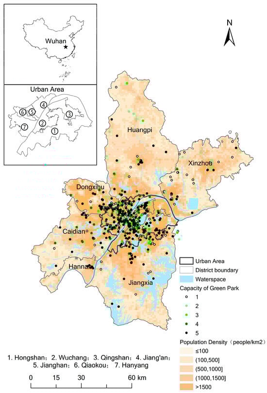 In terms of green space resources, Wuhan had over 700 wetland and urban parks by 2020. According to the 14th Five-Year Plan, the city aims to increase the total number of parks to over 1000 by 2025, with the goal of becoming a “National Ecological Garden City” []. Despite this planned growth, the total amount of developed parkland remains limited, and its spatial distribution is highly uneven. These disparities make Wuhan a representative case for studying issues related to PGS accessibility and equity in large Chinese cities. Consequently, this study selects Wuhan as its case study area.