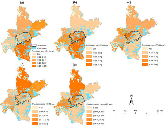 Population ratios of different age groups; (a) 0–19 age group; (b) 20–34 age group; (c) 35–59 age group; (d) 60–79 age group; (e) aged 80 and above.