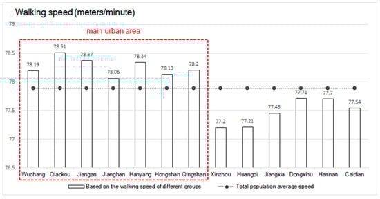 If the variation in walking speeds across age groups are not considered, the walking speed of all Wuhan residents is 77.89 m/min. When accounting for differences in walking speeds across age groups, walking speeds show a remarkable difference in Wuhan, ranging from 75.20 to 78.55 m/min across the study area. In detail, the average walking speeds in each district of Wuhan are shown in Figure 4. It is easy to see that the walking speeds in the main urban areas are clearly higher than those in the suburban region. Qiaokou has the highest walking speed among all districts, reaching 78.51 m/min, while the lowest walking speed in the urban area is in Jianghan (78.13 m/min). In suburban areas, Dongxihu has the highest walking speed at 77.71 m/min, followed closely by Hannan at 77.7 m/min. The lowest walking speeds are found in Xinzhou and Huangpi, at 77.2 m/min and 77.21 m/min, respectively.