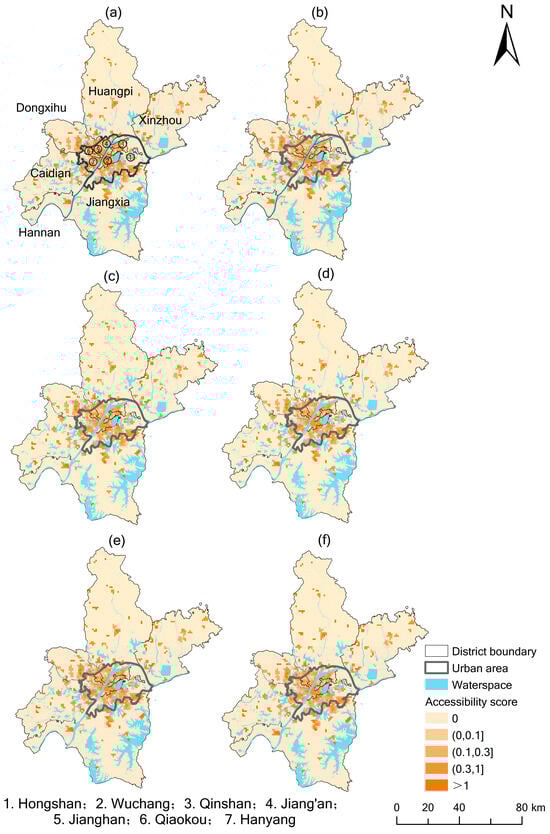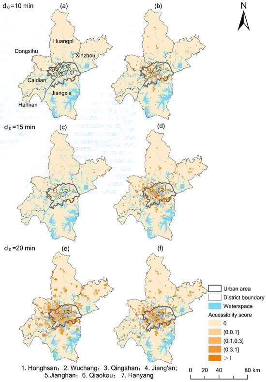 Accessibility scores of PGSs in Wuhan under different thresholds: (a) considering speed variation in age groups (d0 = 10 min); (b) without considering speed variation in age groups (d0 = 10 min); (c) considering speed variation in age groups (d0 = 15 min); (d) without considering speed variation in age groups (d0 = 15 min); (e) considering speed variation in age groups (d0 = 20 min); (f) without considering speed variation in age groups (d0 = 20 min).