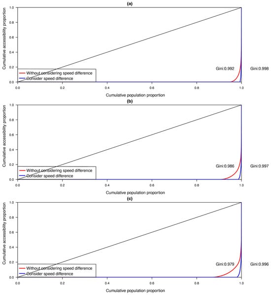 Lorenz curves and Gini coefficients of PGS accessibility: (a) 10 min threshold; (b) 15 min threshold; (c) 20 min threshold.