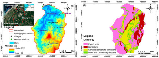 Geographical location of the (a) R’mel watershed and the Tanger Med port in Northern Morocco, (b) lithological map of the study area.
