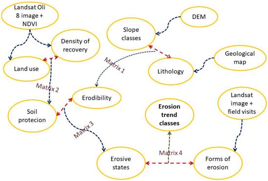 Several organizations (UNEP, FAO, and DGCONA) have mapped and measured the erosion processes caused by rainfall in the Mediterranean regions []. The PAP/RAC approach was developed to analyze the sensitivity of water erosion [,]. It is based on the interrelationships and interdependence of water erosion risk variables. Specific procedures are required to map each element of the approach, primarily the processing, intersection, and analysis of the data sets.