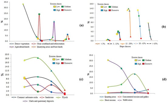 Bare areas and quarries, mainly located in the central zone of the basin, are the leading cause of excessive erosion (Figure 4a). The dense vegetation largely contributes to the low sediment input (34%). Open scrublands and agricultural land are essential in developing moderate erosion processes [,]. These observations also become apparent when analyzing the impact of erosion forms on sediment production (Figure 4c). Indeed, the areas exploited by quarries have the highest percentage in the excessive erosion class. Conversely, the regions stabilized by dense vegetation and afforestation mitigate the spread of erosion processes and ensure the stability of a considerable part of the basin (30%).