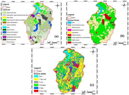 Results of erosion trends: (a) LULC map, (b) forms of erosion, and (c) states of erosion.