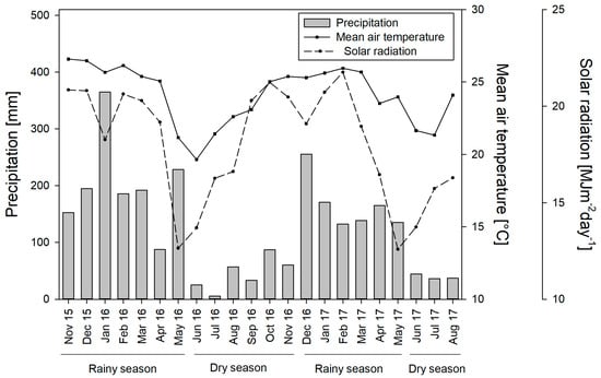 Monthly precipitation, mean air temperature, and mean daily solar radiation recorded over the experimental period at the EMBRAPA Beef Cattle station in Campo Grande, Mato Grosso do Sul, Brazil (20°24′54.9″ S, 54°42′25.8″, altitude 530 m) with a nearby meteorological station.