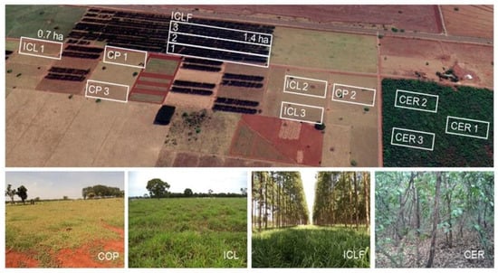 All measurements were performed in four land use systems, defined here as treatments, namely: continuous pastures (COP), integrated crop-livestock system (ICL), integrated-crop-livestock-forestry system (ICLF), and natural Savannah vegetation, Cerrado (CER). Plots of the four treatments were arranged on three replications and located in close proximity (Figure 2). For the CER treatment, measurement plots were established in a large continuous Cerrado area.