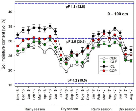 Monthly mean soil moisture content [vol%] for CER: Cerrado, COP: continuous pasture, ICL: integrated crop-livestock, and ICLF: integrated crop-livestock-forestry across 0–100 cm soil profile from Nov 2015 until Aug 2017. Bars represent standard errors with n = 3. Dashed horizontal lines indicate plant-usable field capacity between pF 1.8–2.5 (field capacity) and pF 4.2 (permanent wilting point).