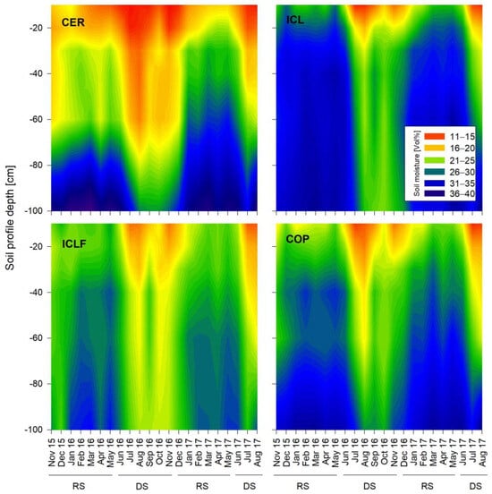 In general, soil moisture content was lowest in the top layers of the profiles and increased with depth. These moisture profiles changed in the dry season, where relatively low soil moisture content was found in greater depths. However, soil moisture content in the observed profiles varied widely between treatments. While the topsoil was driest in CER in all seasons, soil moisture content in the topsoil layers showed only little variation between the other treatments, with COP having the lowest soil moisture content during the peak of the dry season and ICL having higher soil moisture content during the rainy season (Figure 4). In contrast, in profile layers deeper than 30 cm, soil moisture content was, on average, the lowest in ICLF. However, the differences between ICLF and CER in soil moisture content in the deeper soil layers were strongly seasonal, with a large difference during the rainy season and similar values during the dry season. COP and ICL had, on average, soil moisture contents in the deeper soil layers similar to CER, but during the dry season, soil moisture content was higher in COP and ICL than in CER.
