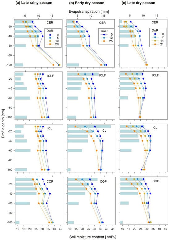 Soil moisture [vol%] kinetics shown for 10 to 100 cm profile depth during dry spells of at least three weeks without rain in three distinguished seasons for the four treatments CER = Cerrado, ICLF = integrated crop-livestock-forestry, ICL = integrated crop-livestock, COP = continuous pasture. Horizontal bars show the water amount of water lost to evaporation in mm from the different soil depths over the course of the respective dry spell. Data are shown as averages over three replications. Error bars have been omitted for clarity.