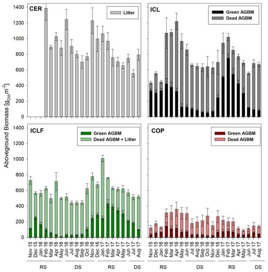 Aboveground biomass (AGBM; from tree biomass, only litter was sampled) was monitored monthly for the entire experimental period and is shown for all treatments in Figure 6. In general, for all treatments, the total AGBM (green + dead + litter) was higher during the rainy season than during the dry season. Comparing the treatments on average over the experimental period, COP had 206 gDWm−2, by far the lowest total AGBM, followed by ICLF with 607 gDWm−2 and ICL with 760 gDWm−2. Comparing green AGBM on average over the measurement period, COP had 60 gDWm−2, the lowest green AGBM, followed by ICLF with 168 g DW m−2 and ICL with 262 gDWm−2. Comparing the dead + litter AGBM pool, COP (146 gDWm−2) was lowest, followed by ICLF and ICL (439 and 497 gDWm−2, respectively), while CER had 899 gDWm−2, the largest amount of litter.