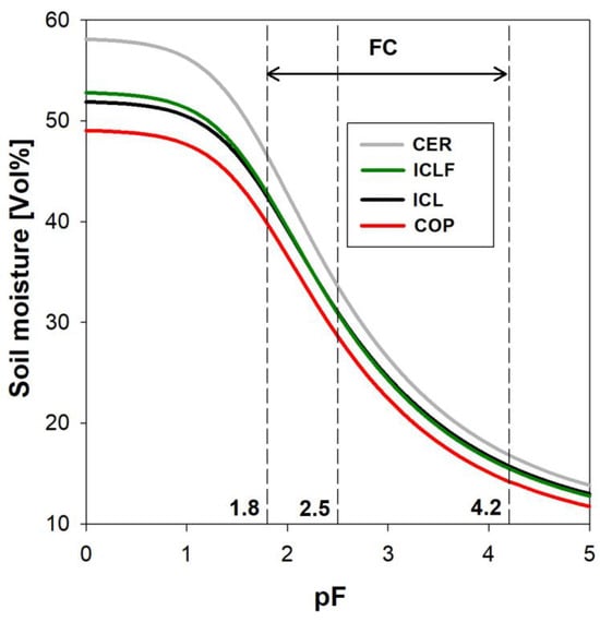 The water retention curves showed higher soil moisture content at the same pF values in the ICL and ICLF systems compared to COP, indicating the potential of integrated systems (ICL and ICLF) and other conservation systems (e.g., No-Till systems) to mitigate the effect of soil compaction in pasture systems and, thus, to restore degraded sites due to lower soil movement, the formation of biopores and input of soil organic carbon [,]. The potential of ICLF systems to improve the soil physical quality has also been described by Moreira et al. [] and Assis et al. [], who found improved soil physical quality in ICLF and ICL systems compared to degraded pastures in the Cerrado biome. In line with our findings, Nóbrega et al. [] found significantly greater bulk densities and smaller Ksat and total porosity in the topsoil of a pasture that was converted from a Cerrado. In contrast to the results reported here, Feitosa et al. [] found higher water retention at field capacity of soils under pasture in the Cerrado biome of northern Brazil, indicating potentially site-specific responses.