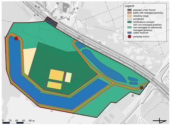 Although our results showed relatively low ecological values in tree stands within the fortification area, the site possesses significant potential for ecological improvement. Typical ecological design parks are often established on wastelands or post-industrial sites, revitalised according to the brownfields principle [], but this approach can also be effectively applied to fortress landscapes. This strategy emphasises the so-called regenerative design aspect, aiming to create spaces capable of regenerating lost resources [,]. Achieving a degree of self-sufficiency is one of the main factors making ecological design so popular [], and that is why we propose using the existing ecological assets, including spontaneous vegetation, so that less interference is needed to maintain the site. Nevertheless, it is important to address current limitations, such as the presence of invasive species and the relatively low ecological value of tree stands, to fully realise this potential. Although ideas for including fortifications in the natural system of Polish cities have appeared at various points in history [,], they were often not implemented. Nowadays, with a shortage of undeveloped land in cities for both construction and green space development, some former fortifications have finally been integrated into urban design. It is also a challenge to respect preserved historical structures, although this should remain a priority during new investments []. In our project, we decided to leave the remaining historic structures untouched, allowing further plant succession while enhancing ecological functionality. The remainings of previous development have been used in similar ways in various projects of restored brownfields and fortifications, for example in the Schanzengraben (former moat of the fortress incorporated into the city structure by giving it recreational functions and preserving the spontaneous vegetation on its banks) in Zurich [] and Park am Gleisdreieck and Natur-Park Südgelände in Berlin (parks with spontaneous vegetation originating from succession on former railyard, with some old infrastructure preserved) [,].