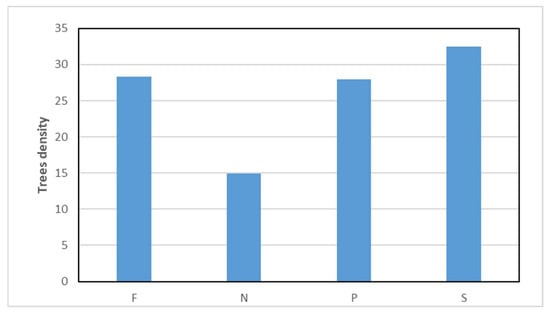 Number of trees per hectare in each zone where trees and shrubs occurred (F—fortifications; N—non-managed or extensively managed greenery; P—paths with managed greenery; S—shooting range).