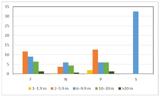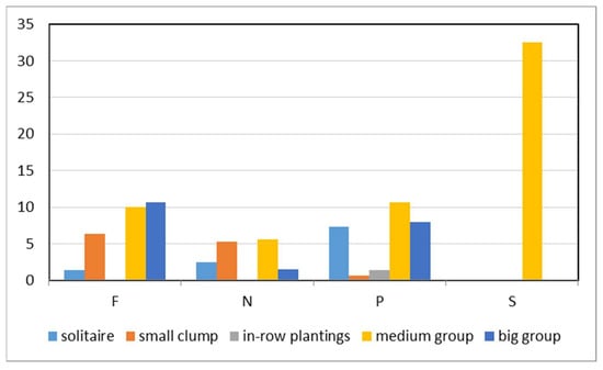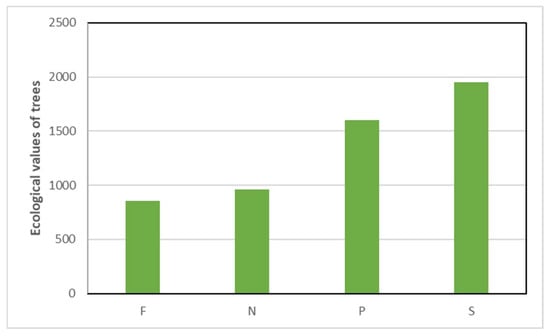 Ecological values of trees in different forms of land use. (F—fortifications; N—non-managed or extensively managed greenery; P—paths with managed greenery; S—shooting range).