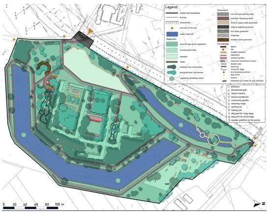 The design concept (shown in Figure 6) was developed based on ecological and accessible design principles. The public space program was diversified in order to encourage visitors to use the space as effectively as possible. The functions of the zones were based on the area’s current user groups and their needs. The new diversified functional–spatial program aims to take advantage of the large, wastefully planned areas of the site and prevent its abandonment and pollution. Each area was assigned a clear main function, which prevents the continuation of the current bland character. At the same time, the design of the public space is intended to introduce visitors to the issue of urban biodiversity (its function and ways of protection). As a result, the area combines the aspects of leisure and recreation (pump tracks, resting areas with benches, and dog play areas), nature (being an important local part of the city’s ecological system), and education (didactic path integrating historical and environmental themes).