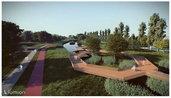 The spontaneous composition of the vegetation was preserved; however, it was planned to replace invasive species with native ones, especially on the fortifications, where the trees have low ecological value. It was decided to leave native tree stands, especially large groups, due to their phytoremediation and ecological values, as well as their positive impact on human well-being. Restoration of the fresh meadows (mowed 2 times per year) occurring in the study area was planned. The species were selected based on the existing and potential vegetation (riparian habitat) and from the dynamic circle of eutrophic or mesotrophic deciduous forests (they were chosen because the area was cut off from floodwaters responsible for the preservation of riparian forests). An additional didactic path (Figure 7) will lead through the site (with the permeable, mineral-resin surface; in some parts, the path will be routed on wooden bridges). This path allows observation of rushes enriched with plant species typical for those habitats: Alisma plantago-aquatica L., Butomus umbellatus L., Iris pseudacorus L., Mentha aquatica L., and Sparganium erectum L. emend. Rchb. Additionally, plantings of aquatic vegetation with floating leaves were planned: Nuphar lutea (L.) Sm., Nymphaea alba L., and Polygonum amphibium L. It was also chosen to implement some Alnus glutinosa (L.) Gaertn. trees on the edge of the reeds. The path was designed to explain aspects of the fort’s natural and historical values, shown on educational boards. This will allow users to learn about, among other things, the vegetation cover of the site, the importance of urban biodiversity, and the impact of invasive species on flora and fauna.