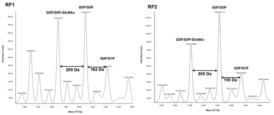 Because mAb glycosylation is a major property of the Ab structure and therapeutic effects, we analyzed the mass of each mAb and BsAb to determine their glycosylation. First, H0 and R0 were analyzed, and the main glycoforms observed were G0F/G0F, G0F/G0F-GlcNAc and G0F/G1F (Figure 2). The mass spectra of the RF1-4 (Figure 3) and HF1-4 (Figure S8) BsAbs showed the same glycoforms as those identified for the native mAbs R0 and H0.