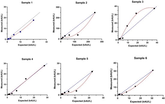 Linearity assessment for six samples. Linearity was assessed by polynomial regression. Dots are the concentration obtained from dilution. The blue color line is the dilution expected and the red color line is the dilution obtained.