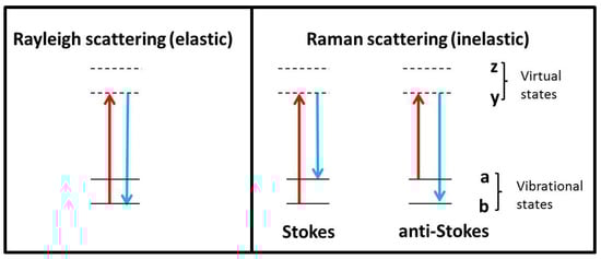 Raman spectroscopy is the inelastic scattering of light from molecules in the presence of a monochromatic light source [,]. When light (or photons) interact with a molecule, it can induce a transition in energy state that leaves the molecule in an excited vibrational state. The majority of scattered photons from the molecule are scattered without any change in energy (elastic or Rayleigh scattering). A small fraction of photons however, will be scattered at a different energy from that of the incident light. This effect is referred to as inelastic or Raman scattering. This difference in scattered frequencies, or Raman shift, is measured in units of cm−1 (wavenumber which is equal to 1/wavelength of the Raman shift). It is a relatively weak process, with a probability of 1 in 106−108 photons being scattered this way [,]. The frequency of the Raman scattered photon can be either less than the incident frequency (Stokes scattering) or greater than the incident frequency (anti-Stokes scattering) (Figure 1). Before spectra collection, the instrument is usually calibrated using materials that have strong Raman peaks such as silicon (520 cm−1) and diamond (1332 cm−1) []. These materials are either integrated into the instrument or may be external. Ideally, the choice of material should have Raman peaks in the same wavenumber range of the sample to be examined. The process of collection is optimized using spectral parameters such as laser power, exposure time, and number of accumulations [,].