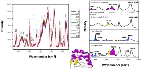 (a) pH-induced changes in the Raman spectra of lactalalbumin from pH 0.8–7.8, (b) Shaded peaks in the Raman spectra of selected polypeptides and phenylalanine, assigned to specific protein structure: -α-helix (purple), β-sheet (yellow) and aromatic residues (blue) [].