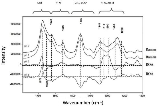 Raman and ROA spectra of IgG1 at pH 3 and 7 showing significant changes in the amide I and III regions for ROA spectra only. Reproduced with permission from []. Copyright Bentham Science Publishers Ltd. (2009).