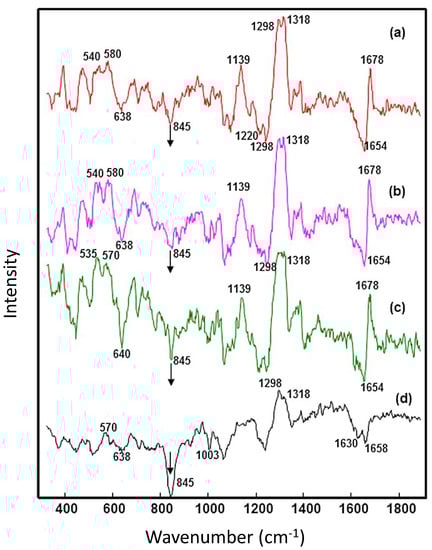 - Lord, R.; Yu, N.-T. Laser-excited Raman spectroscopy of biomolecules: I. Native lysozyme and its constituent amino acids. J. Mol. Biol. 1970, 50, 509–524. [Google Scholar] [CrossRef]