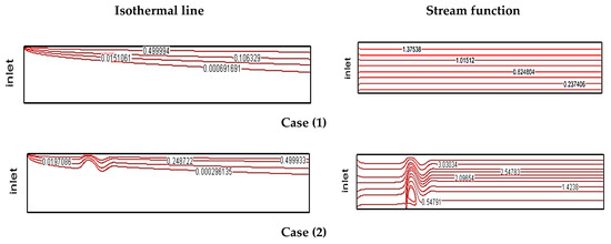 In Figure 4, streamline contours (right side) and constant temperature contours (left side) are shown for Re = 10, B = 0.04, and φ = 2% for cases 1, 2, 3, and 4. In these contours, the effect of fluid motion with minimum velocity along the microchannel at different nanofluid jet injection on the heated surface was investigated. The temperature difference between inlet cold fluid and the heated wall improves heat transfer and creates temperature gradients. Fluid motion and its impact with the solid walls of the microchannel creates velocity gradients in areas close to the wall. In general, fluid motion along the microchannel leads to the creation of velocity and thermal boundary layers. Nanofluid jet injection on fluid direction results in the elimination of velocity and thermal boundary layers. In all contours, by increasing the number of fluid jets, areas with eliminated boundary layers become larger. Areas with a high number of jet injections have smaller velocity boundary layers. In the cases with more jets, due to the high volume of crossing fluid, axial velocity parameters of fluid are higher than the cases with fewer jets.