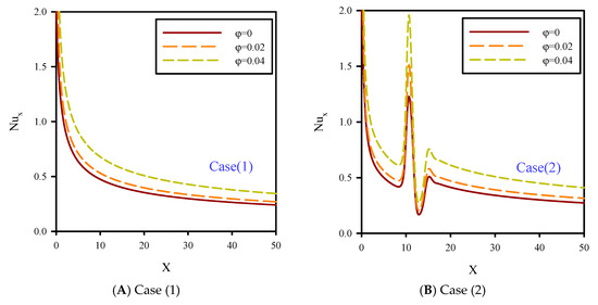 In Figure 6, the local Nusselt number on the heated wall of the microchannel is shown for Re = 10, B = 0.04, and different nanoparticles volume fractions. In this figure, we have different jet numbers with minimum fluid velocity. Nanoparticle volume fractions were 0–4%. Heat transfer occurs because of temperature differences between fluid and the top heated wall. The value of heat transfer has a direct relationship with Nusselt number and temperature line slope. Uniform temperature distribution and removal of temperature gradients are desirable and lead to higher Nusselt numbers. The local jump in the Nusselt number in Figure 6 was because of the low temperature of the injected fluid jet on the heated surface. In these areas, the heat transfer distribution was more uniform and the Nusselt number increased. In all curves for Figure 6, by adding nanoparticle volume fraction, the Nusselt number and heat transfer were significantly increased.