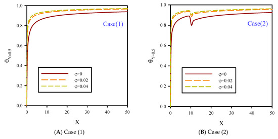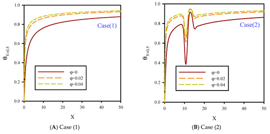 In Figure 8, local dimensionless temperature distribution on flow centerline for Re = 10, B = 0.04, and volume fractions of 0–4% is presented. The dimensionless temperature distribution in the central section of the microchannel was influenced by the reduction of fluid velocity and jet number for cases 1, 2, 3, and 4, and different nanoparticle volume fractions. Because of the temperature difference between the fluid and heated surface, the penetration of the thermal boundary layer affected all areas of the microchannel, especially the areas in the central line of flow. Figure 8 shows that increasing ϕ resulted in higher thermal conductivity of the microchannel and uniform temperature distribution in all areas of the microchannel, especially in the heated areas. Due to the higher thermal conductivity of cooling fluid in higher nanoparticle volume fractions, temperature gradients in heated areas were diminished, and also, the conductivity of the fluid layers was higher. Therefore, by increasing ϕ, heat transfer penetrated the flow centerline, and because of the higher conductivity of the fluid layers, the fluid temperature rose.
