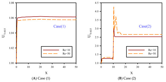 In Figure 11, dimensionless axial velocity along the flow centerline at Reynolds numbers of 10 and 50, B = 0.08, and φ = 2% are shown. Unlike Figure 10, the slip boundary condition was applied to the solid walls which facilitated fluid motion and reduced the velocity boundary layer on the solid walls of the microchannel. Therefore, the velocity profile in the flow centerline for all cases of 1, 2, 3, and 4 were lower than Figure 10. According to Figure 10 and Figure 11, increasing the slip velocity coefficient on the solid walls of the microchannel at Re = 10 had less effect than Re = 50. At Re = 50, the lateral mixture of flow covered more areas in the case with slip boundary conditions (BCs) compared with the no-slip BC case. According to Figure 11, this factor resulted in the microchannel contraction which increased the effect of jet injection areas and local axial velocity.