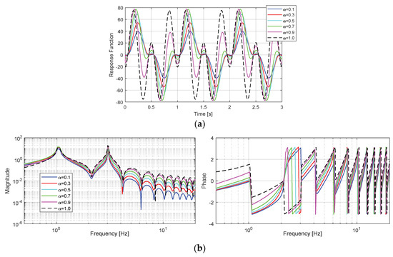 Timed evolution and spectral composition of the response function were, respectively, presented in Figure 1 and Figure 2. The results related to the regular derivative case (α = 1) were differently marked onto the graphs in order to facilitate comparative analysis. For spectral distribution, both magnitude and phase components because some changes in frequency evolution were considered and have more visibility into the phase diagram than the magnitude.