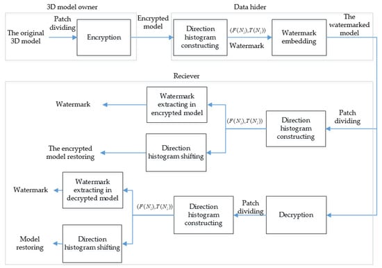 In order to protect the security of 3D model in the cloud, a homomorphic encryption-based robust reversible watermarking method is proposed. Figure 1 shows the flowchart of the proposed method. Firstly, the original model is divided into patches, and vertices in each patch are encrypted using the Paillier cryptosystem. In the cloud, three direction values of each patch are computed, and the direction histogram is constructed for shifting to embed the watermark. At last, the watermark can be extracted from direction histogram, and the original 3D model can be restored by histogram shifting.