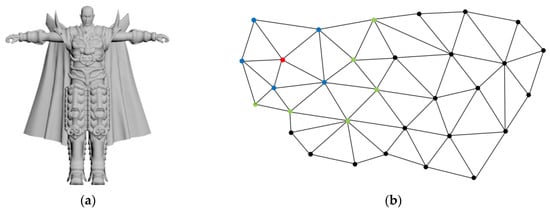 where are the number of the vertices of the 3D model, and represents the number of vertices between and . As illustrated in Figure 2, the blue vertices are the 1-ring neighborhood of the red vertex, and the green vertices are the 2-ring neighborhood of the red vertex.