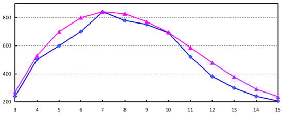 Due to the spatial correlation of the 3D model, the vertex coordinates are relatively close in space. According to the experiments on multiple 3D model, the direction values are usually in a certain range, and the maximum direction value is usually related to the number of vertices in the patch. As illustrated in Figure 5, the blue line shows the change in the maximum direction value when the number of vertices in the patch changes. The red line is the fitted curve of the blue line, and its fitting function satisfies