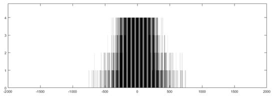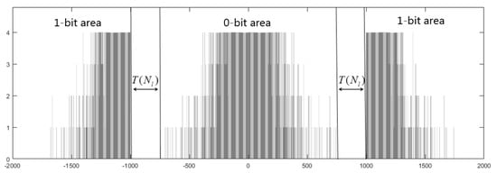 Suppose that denotes the direction value with watermark. After embedding the bit ‘0′, is still in the range , so is called the 0-bit area. After embedding the bit ‘1′, will be changed by the size of for making within the range or . and are called the 1-bit area. Finally, the encrypted model with watermark can be obtained. For example, after embedding 1000 bits, the direction histogram is shown in Figure 8. When embedding the bit ‘0′, the direction values are still in the 0-bit area. When embedding the bit ‘1′, the direction values will be shifted into the 1-bit area. Moreover, the 0-bit area and the 1-area are separated by the robust interval of size . Hence, the watermark is embedded successfully.