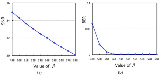 According to Equation (29), , and the embedding function is changed by changing the value of . According to Equation (31), if the value of is large, the distortion of the decrypted model is high and the accuracy of watermark extracting is high, and vice versa. In order to observe the effect of on the quality of decrypted model and the bit error rate of the extracted watermark, we changed the value of to perform on 40 tested models and calculated their average. The relationship between the value of and the distortion is illustrated in Figure 10a. As increases, gradually decreases. When = 588, of the decrypted model is slightly greater than 30 dB. Based on imperceptible considerations, in order to obtain better model quality, the value of cannot exceed 588. The relationship between the value of and BER is shown in Figure 10b. When , the watermark was correctly extracted without being attacked. Therefore, the value of b cannot be less than 528.
