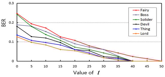 As illustrated in Figure 11, the BER of watermark extraction is low under Gaussian noise (0.01). By increasing , the BER could be reduced. When , the watermark could be extracted correctly. Therefore, when higher robustness is required, the value of can be assigned to be 50.